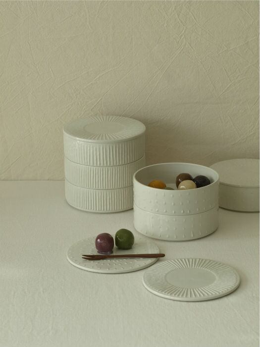 表面に点と線をほどこして、素朴な印象に仕上げてあります。蓋は皿としても使っていただけます。